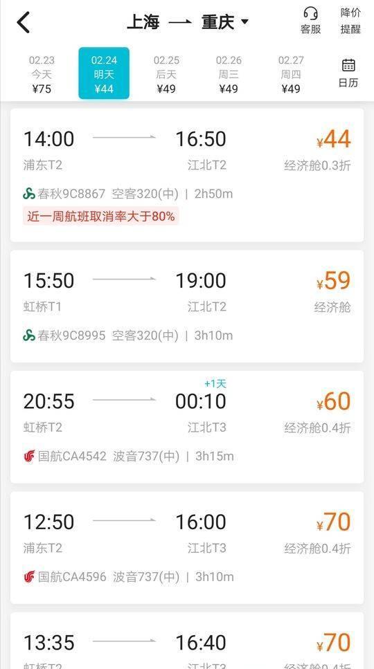 2月23日,不少网友反映,近期从深圳、上海等地前往成都、重庆、西安等城市的机票出现“白菜价”,一般在100元左右,最低只需44元。