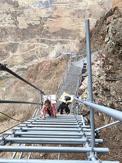 在搬下山之前,阿土列尔村村民只能通过宽1.5米、总长度2.8公里的钢铁“天梯”进出。图为村民们背着背篓攀爬钢梯。新华社记者 薛晨摄
