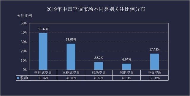 从2019年不同类型空调的关注比例中我们可以看出壁挂式空调作为最刚需的产品类型依旧是消费者关注的主流,而对于主打客厅使用的立式空调则紧随其后,移动式空调作为租房和小户型家庭的临时需求,在关注度上也并不低。