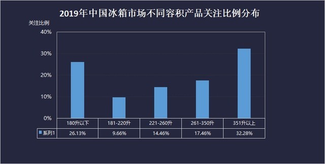 消费者对于多门冰箱的高需求直接反映在大容量需求上。根据ZDC数据显示,351L以上的冰箱关注比例有绝对优势,占32.28%;位居第二的是180L以下的冰箱,关注比例达26.13%。市场消费分级明显,主要归结于大家的预算。