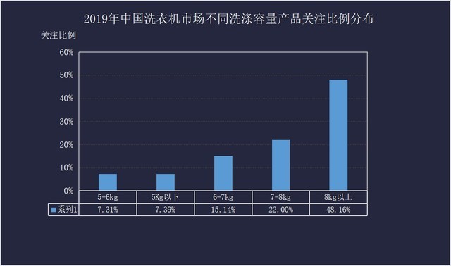 洗涤容量:8KG以上大容量关注度近半,小容量失宠