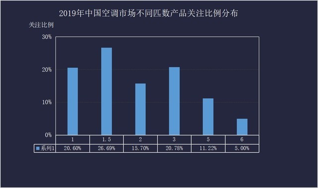 空调的匹数决定了空调的适用面积,从整体数据来看1.5P依旧是用户关注的核心点,而1P、2P和3P的产品紧随其后,这四个匹数也基本涵盖了主流消费者对家用式分体空调的主要消费的匹数区间,用以分别满足卧室、小卧室、客厅的使用需求。