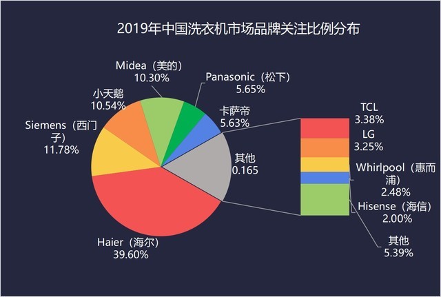海尔作为国内洗衣机行业的龙头老大,市场的关注度一直是摇摇领先,虽然2019年全年关注占比有所下滑,但整体的关注度仍然超过39.6%,当然海尔的高关注度也离不开海尔在2019年全年关于技术和产品热点的营销事件的打造。