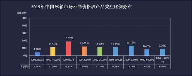 根据ZDC提供的调研数据显示,2500元以下冰箱关注比例同比2018年变化较大,2019年关注比例已经超过53%,但高端家电关注比例也有所提升,6000元以上的冰箱关注度为17.5%。