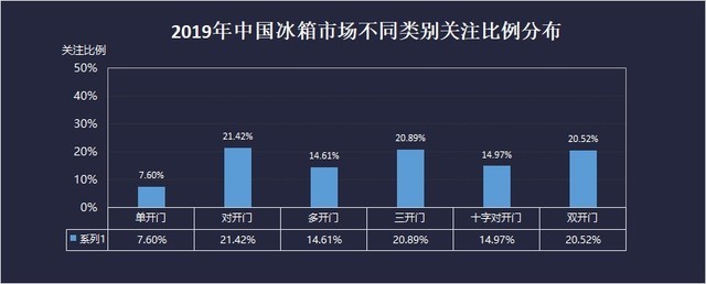 反映到数据方面来看,对开门、十字对开门、多门冰箱关注度较高,对比上半年ZDC数据报告来看变化不大。十字对开门与多门冰箱的关注度接近30%,比上半年关注度略有提升。