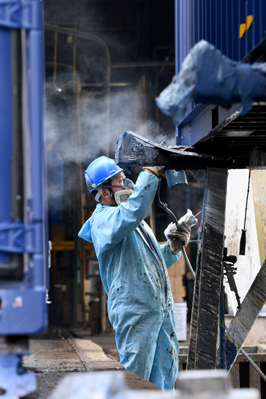 3月28日,在漳州中集集装箱有限公司集装箱成品出口处,工人检查喷漆遗漏。