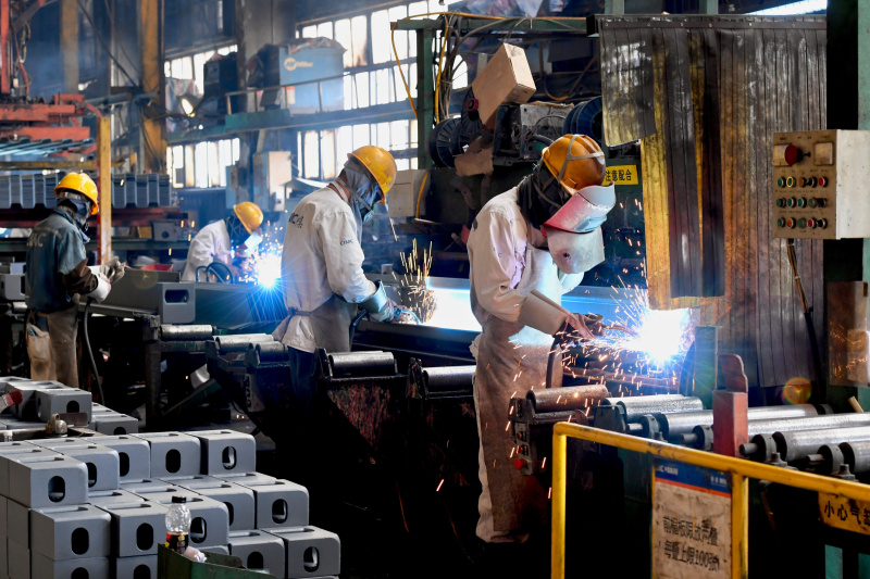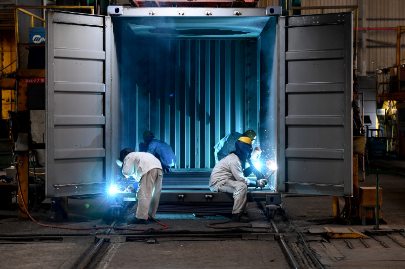3月28日,在漳州中集集装箱有限公司生产车间内,工人焊接生产集装箱。