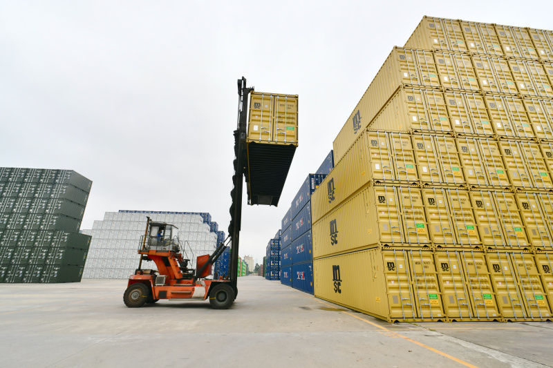 3月28日,在漳州中集集装箱有限公司堆场内,工人转运铁路集装箱。