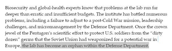 其二是行政干预过多。从研究所主任的选拔来看,以前都是从陆军实验室研究人员中提拔出来,但在过去10年里,RIID一共换了五任所长,没有一个是懂行的科学家,他们怎么能够充分理解复杂的P4实验室结构和广泛的研究任务。