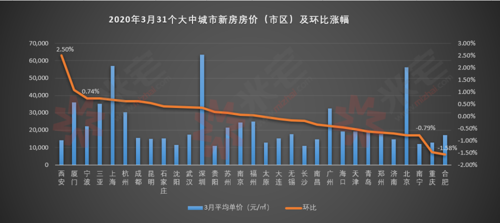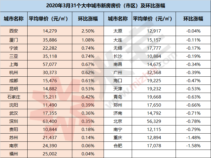 根据数据统计,2020年3月份,31个大中城市中,价格上涨城市数量增多,共16城市上涨,较今年2月份增加4个城市。环比涨幅最高的是西安(2.5%),其次为厦门(1.08%)。