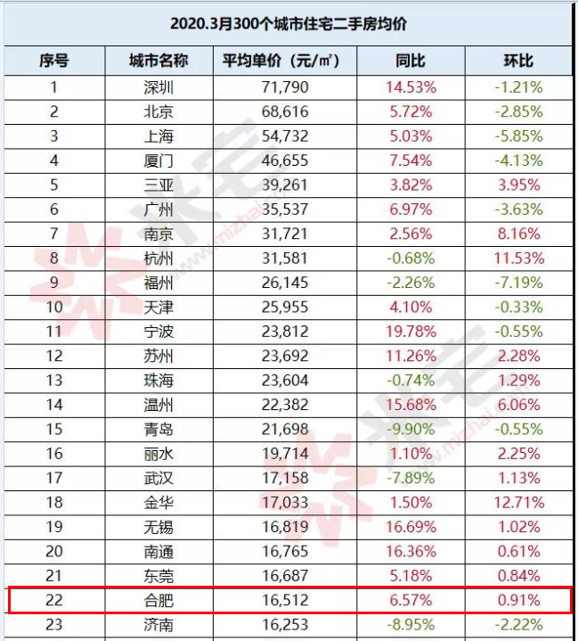 此外,米宅还发布了全国300个城市二手房房价。从图中数据得知,合肥2020年3月二手房均价16512元/O,同比增长6.57%,环比上涨0.91%,上涨幅度比新房高。