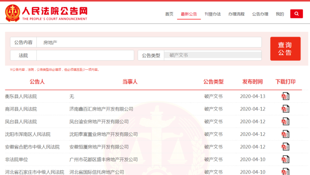 根据人民法院公告网公布信息显示,截止到4月13日,2020年全国有约157家房企发布破产公告。