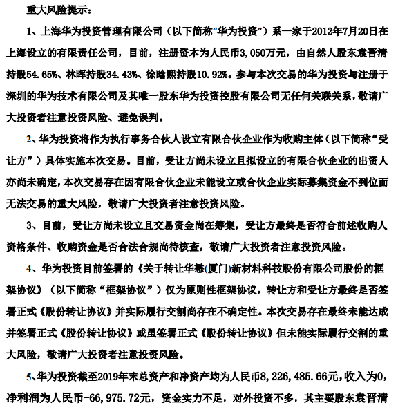 让人拍案叫绝的,是重要风险提示里的各种操作。首先,华为投资的出资人仍未确定,华懋科技称这次的合作很有可能因为华为投资资金不到位而结束。另外,本次签署的框架协议仅为原则性框架协议,意思就是八字还没一撇。华为投资的经营不善我们已经提过了,但是公告里还提到该公司的两位大股东都缺乏上市公司的相关投资经验。