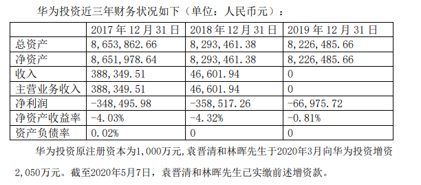 另外,更令人震惊的是,华为投资在去年一年里营收居然是0,并且净利润亏损了6.7万元。这还不算最亏的一年,在17年,净利润亏损34.85万元,18年亏损更是高达35.85万元。让人不禁满头问号,那这入主华懋科技的14.78亿元是从哪里掏出来的?