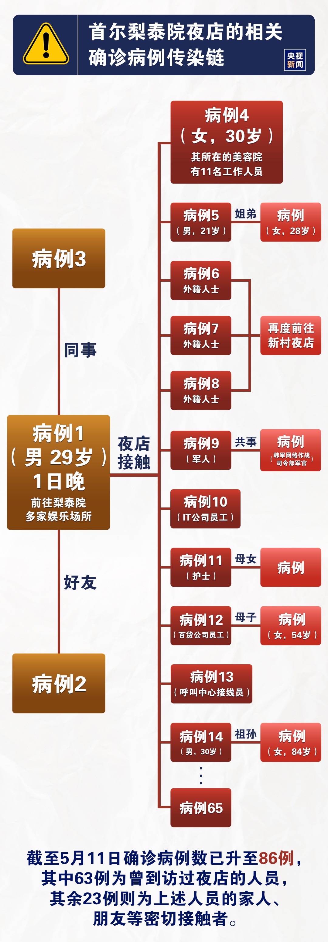 据央视新闻,韩国卫生部门6日通报,一名来自京畿道的29岁男性确诊感染新冠肺炎。确诊前该男子曾前往首尔龙山区梨泰院多家酒吧、夜店。根据最新通报,目前与首尔梨泰院夜店相关的新冠肺炎确诊病例数已升至86例,其中63例为曾到访过夜店的人员,其余23例则为上述人员的家人、朋友等密切接触者。这起集体感染事件还引发了二次感染,当晚在夜店的一名25岁的男性传染了他28岁的姐姐;一名护士传染了她的妈妈;一军人传染给了其他军官。据韩国中央防疫对策本部11日通报,在确诊感染的病例中,首尔的病例数为51例,京畿道21例,仁川市7例,忠清北道5例,釜山和济州道各1例。由于病例散布较广,疫情防控难度也越来越大。据韩联社5月11日报道,4月24日至5月6日,去过梨泰院相关夜店的人员共有5517人,目前尚有3112人无法取得联系。