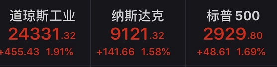 周五美国三大股指集体收高,道指涨逾450点,纳指涨1.58%,标普500指数涨1.69%。卡特彼勒涨4.5%,埃克森美孚涨4.4%,波音涨3.7%,纷纷领涨道指。金山云上市首日收涨逾40%。