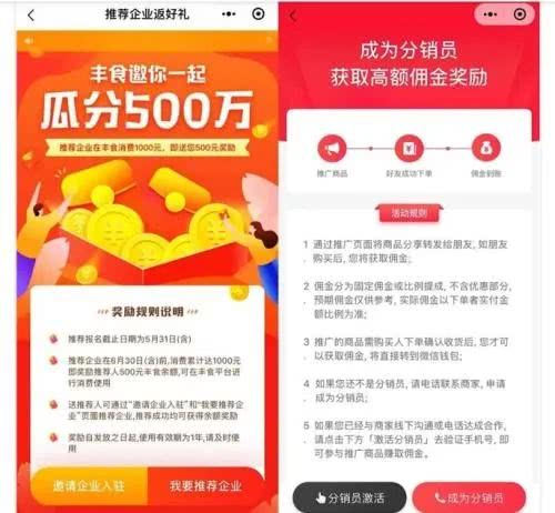 据悉,目前丰食推出了“瓜分 500万”的活动,用户可通过“邀请企业入驻”和“我要推荐企业”页面推荐企业。奖励十分诱人——企业成功入驻后,推荐人将获取 1 元奖励。而推荐的企业 6 月 30日前在丰食消费 1000元,推荐人还可另外获得 500元奖励。