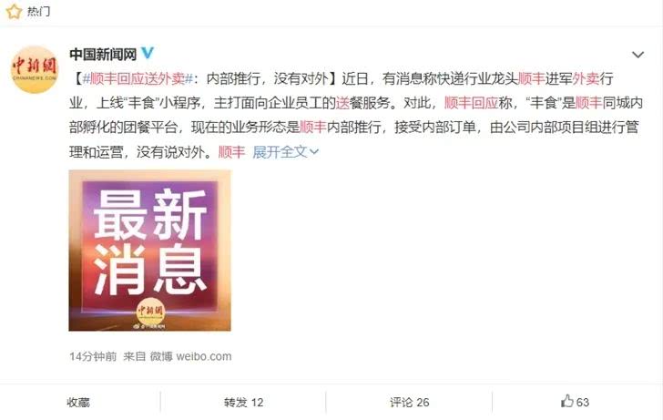 顺丰也就送外卖一事进行了回应,称“丰食”是顺丰同城内部孵化的团餐平台,现在的业务形态是顺丰内部推行,没有对外。
