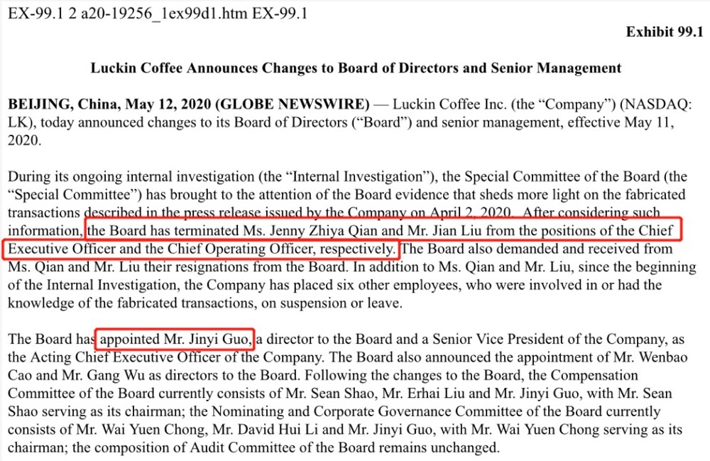 5月12日晚,瑞幸咖啡发布公告称,董事会特别委员会监督主导的独立调查组发现了更多关于财务造假的证据。瑞幸咖啡开始清洗管理层,公告显示,被解雇的除了瑞幸公开指控的造假“元凶”COO刘剑外,还有瑞幸创始人兼CEO钱治亚。
