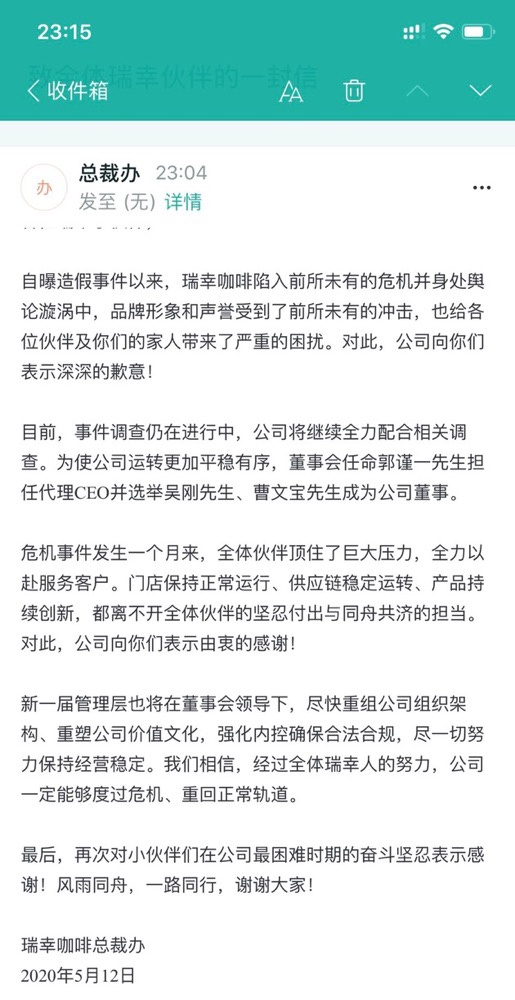 5月12日晚间,瑞幸咖啡总裁办发布内部信向全体员工致歉,称造假事件发生以来,瑞幸咖啡陷入前所未有的危机,品牌形象和声誉受到影响,为受到困扰的员工致歉。