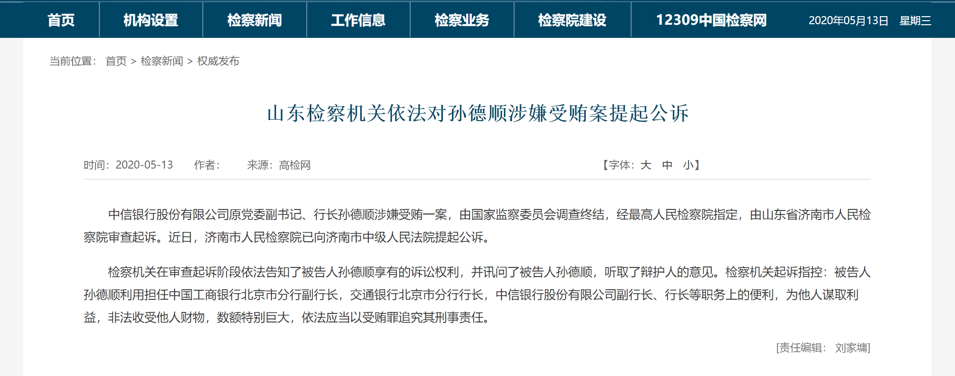 5月13日,据最高检消息,中信银行股份有限公司原党委副书记、行长孙德顺涉嫌受贿一案,由国家监察委员会调查终结,经最高人民检察院指定,由山东省济南市人民检察院审查起诉。近日,济南市人民检察院已向济南市中级人民法院提起公诉。检察机关在审查起诉阶段依法告知了被告人孙德顺享有的诉讼权利,并讯问了被告人孙德顺,听取了辩护人的意见。检察机关起诉指控:被告人孙德顺利用担任中国工商银行北京市分行副行长,交通银行北京市分行行长,中信银行股份有限公司副行长、行长等职务上的便利,为他人谋取利益,非法收受他人财物,数额特别巨大,依法应当以受贿罪追究其刑事责任。