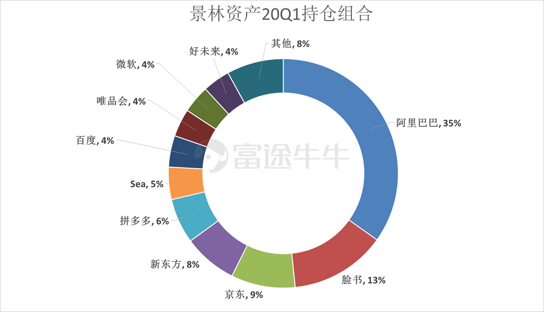 整体来看,阿里巴巴仍然位居景林资产第一大持仓股,占比达35%;第二大持仓股为Facebook,一季度增持20%。
