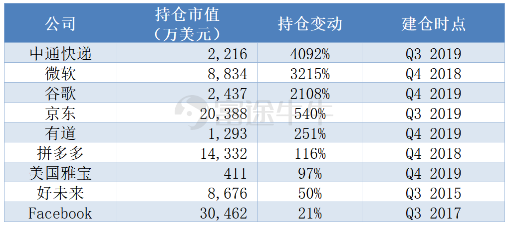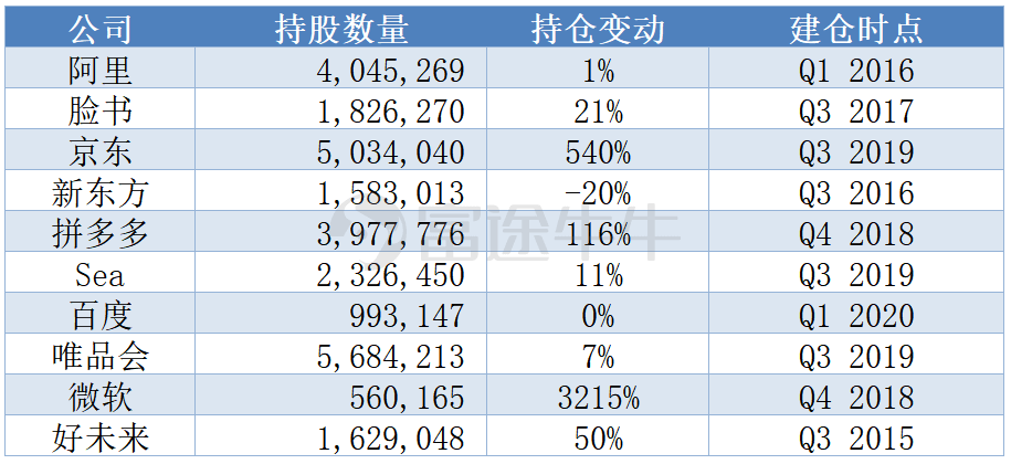 第三大持仓股为京东,从19年四季度仅占投资组合2%一举增至9%,增持539%,而京东今年以来涨幅已达35%。
