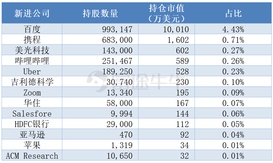 新建仓的股票除百度外,占投资组合比例不足1%,但其中不乏哔哩哔哩、吉利德科学、Zoom等近期热门股票。