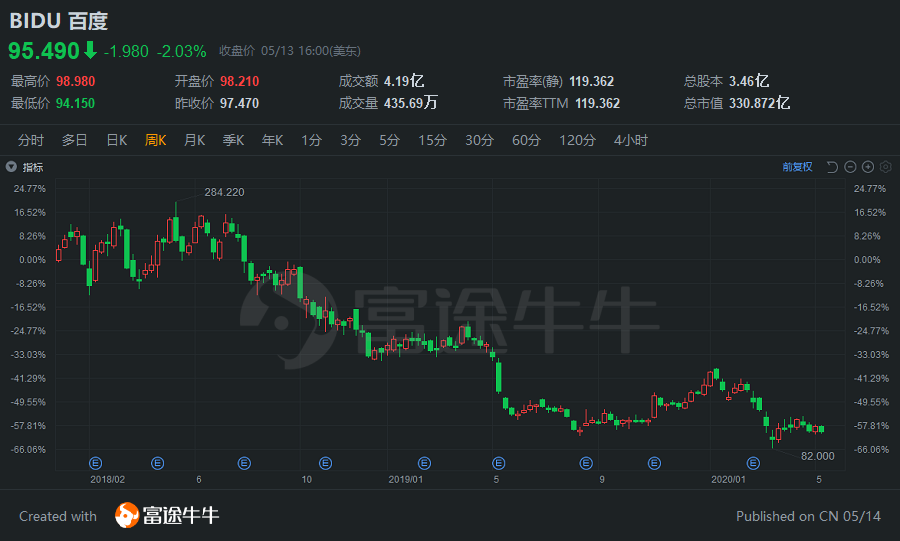 但即便业绩亮眼,但今年以来百度股价仍跌近25%,而在18年、19年,跌幅分别为32%、20%,昔日互联网巨头仍在等待市场拐点。