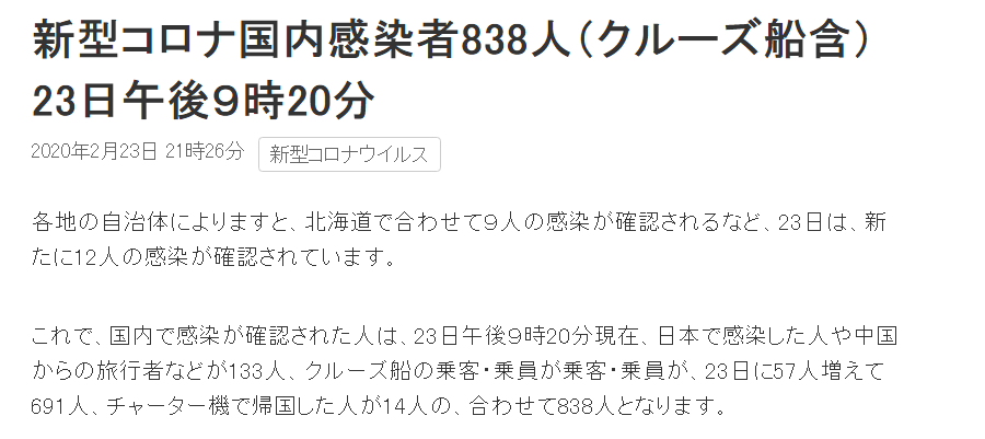 据日本放送协会最新报道,截至当地时间2月23日晚9点,日本全国共计有838名确诊患者,其中“钻石公主”号邮轮上共确诊691例,在日本国内的日本人和中国游客等共133例,从武汉乘坐包机返回者14例。