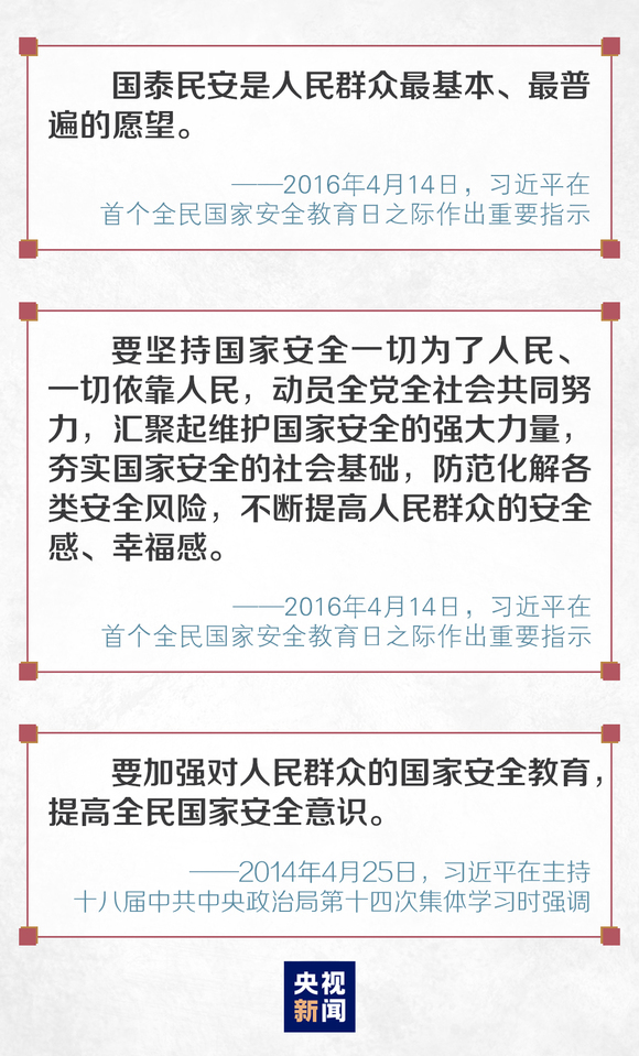 习近平总书记在主持召开中央国家安全委员会第一次会议时指出,既重视国土安全,又重视国民安全,坚持以民为本、以人为本,坚持国家安全一切为了人民、一切依靠人民,真正夯实国家安全的群众基础。