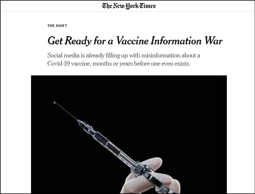 14日,《纽约时报》刊登了一篇名为“为疫苗信息战做准备”的文章,该文点出了一个听着荒谬、却实实在在的麻烦:就算新冠病毒的疫苗研发成功,万一有大半的美国人都不肯接种怎么办?