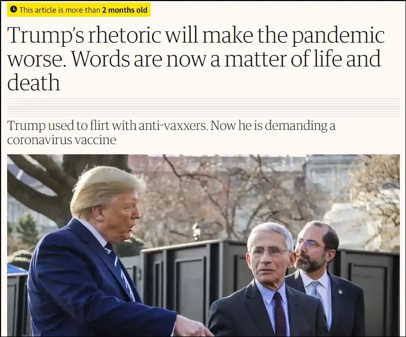 提到特朗普点赞反疫苗言论的报道,图源:英国《卫报》