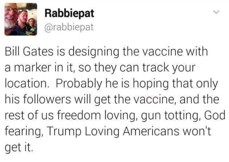 比如这则社交媒体上的留言就写道:“比尔·盖茨会把追踪器放进疫苗,以监控所有人,而我们这些特朗普的支持者是不会上当的。”