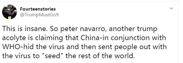 “这是疯了吧。彼得·纳瓦罗,特朗普的又一名追随者竟然声称中国与世卫组织一同隐藏了病毒,然后派人把病毒“播种”到世界其他地方。”