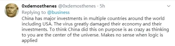 “中国在包括美国在内全球多数国家都进行了大量投资。病毒已严重伤害到了他们的经济和投资。认为中国是故意这样做,就跟认为你自己是宇宙中心一样疯。毫无逻辑。”