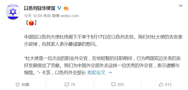今天上午,以色列驻华使馆对杜伟大使意外去世表示哀悼。“我们对杜大使的去世表示哀悼,向其家人表示最诚挚的慰问。”