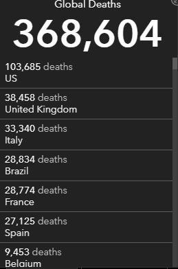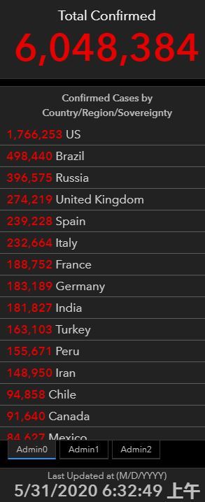 据约翰斯·霍普金斯大学统计,截至北京时间5月31日6点32分,全球累计确诊新冠肺炎6048384例,病亡368604例。