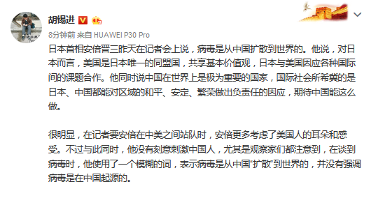 日本首相安倍晋三昨天在记者会上说,病毒是从中国扩散到世界的。他说,对日本而言,美国是日本唯一的同盟国,共享基本价值观,日本与美国因应各种国际间的课题合作。他同时说中国在世界上是极为重要的国家,国际社会所希冀的是日本、中国都能对区域的和平、安定、繁荣做出负责任的因应,期待中国能这么做。很明显,在记者要安倍在中美之间站队时,安倍更多考虑了美国人的耳朵和感受。不过与此同时,他没有刻意刺激中国人,尤其是观察家们都注意到,在谈到病毒时,他使用了一个模糊的词,表示病毒是从中国“扩散”到世界的,并没有强调病毒是在中国起源的。