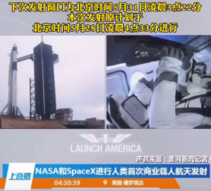 北京时间5月28日凌晨, SpaceX首次载人航天任务,因天气原因推迟发射,下次发射窗口为北京时间5月31日凌晨3点22分。本次发射原计划于北京时间5月28日凌晨4点33分进行。