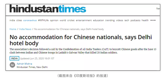 《环球时报》微信公众号近日发文称,据印度媒体报道,印度首都新德里的一个酒店和餐馆行业组织于本周四表示,该组织旗下的3000家酒店将不会再给任何中国公民提供住宿服务。