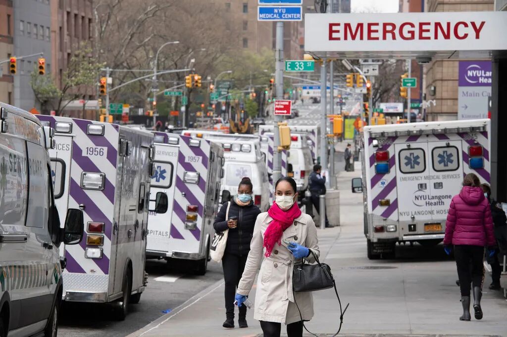 救护车在纽约贝尔维尤医院外排队等候 |联合国图片