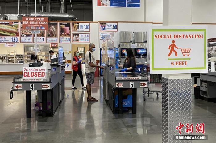 当地时间4月18日,美国休斯敦民众在当地一大型批发超市结账。收银处安装了透明挡板。超市内贴有许多呼吁人们保持6英尺社交距离的提示牌。中新社记者 曾静宁 摄