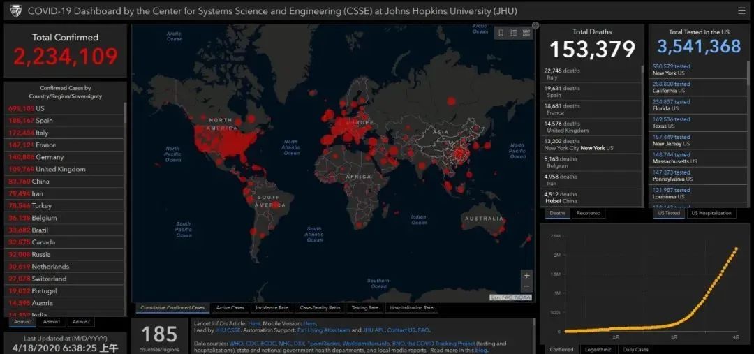 据美国约翰斯霍普金斯大学发布的实时统计数据显示,截至北京时间4月18日6时38分,全球累计确诊新冠肺炎病例2234109例,死亡153379例。