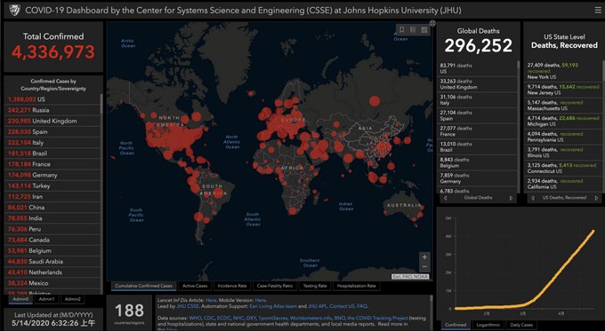 据约翰斯·霍普金斯大学的实时数据,截至北京时间5月14日6时32分,全球累计确诊超433万例,累计死亡近30万例。世卫组织最新判断:目前疫情对全球仍构成高风险;很难预测何时可以战胜新冠病毒,它可能成为永远不会消失的流行性病毒。