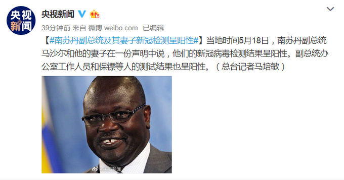 当地时间5月18日,南苏丹副总统马沙尔和他的妻子在一份声明中说,他们的新冠病毒检测结果呈阳性。