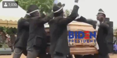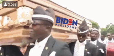 据CNN描述,拜登和特朗普因为口罩结下的梁子大致是这样过程。首先,拜登25日前往特拉华州一处退伍军人纪念园,向阵亡将士敬献花圈。他佩戴黑色口罩加黑色墨镜,面部几乎被全部遮住的样子被美国媒体广泛报道。FOX新闻主播布里特·休姆随后发推嘲笑拜登说,“这或许可以解释特朗普总统为什么不愿意佩戴口罩出现在公众面前”。而特朗普转发了休姆的推特,虽然一句话没说,但也是表明了态度。发帖小能手特朗普从来不让人失望,时刻走在时尚潮流前端,这回还玩上了“黑人抬棺”的梗。