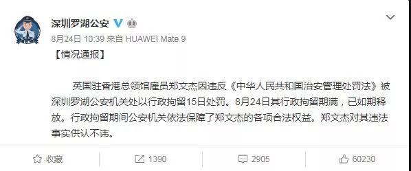 2019年8月9日,英国驻香港总领事馆雇员郑文杰因违反《中华人民共和国治安管理处罚法》第六十六条规定,被深圳罗湖警方处以行政拘留15日的处罚,其对嫖娼的违法事实供认不讳。8月24日,其行政拘留期满被释放。