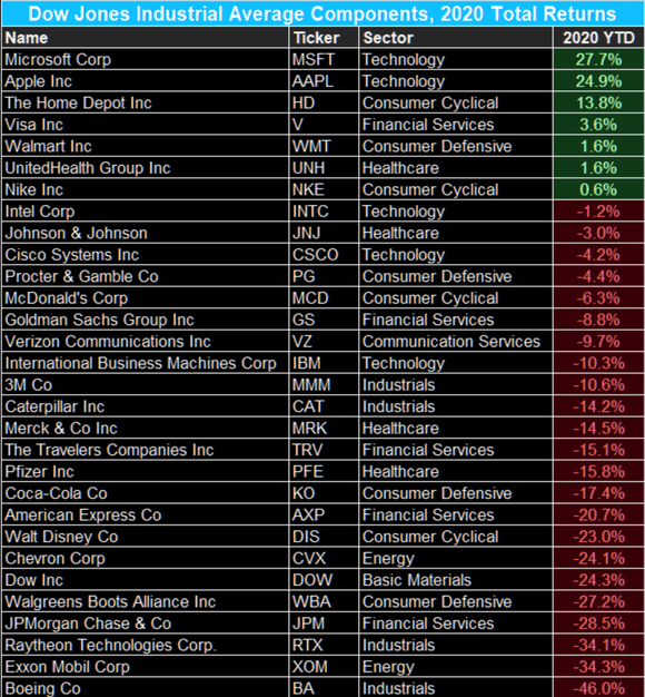 波音仍垫底道指30只成分股,年初至今跌幅达到46%。微软则成为道指30只成分股中的赢家,年初至今涨幅达到近28%,苹果次之,涨幅近25%。