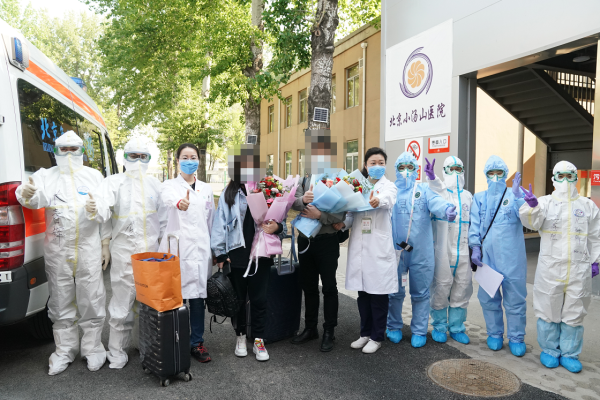 28日上午8点30分,18岁的韩女士和50岁的余先生在医护人员的带领下推着行李箱从北京小汤山医院病房楼走出。在与医护人员道别后,登上了两辆已经停在门口的转运车。